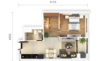 Căn hộ 1PN + 1WC hướng tới cặp vợ chồng mới cưới với diện tích khoảng 47m2. Không gian được quy hoạch rộng rãi vừa đủ cho 2 người với phòng ngủ khép kín, đề cao tính riêng tư hơn căn studio. Cấu trúc căn 1PN +1WC gồm: 1 phòng khách, 1 phòng bếp, 1 nhà vệ sinh, 1 phòng ngủ.