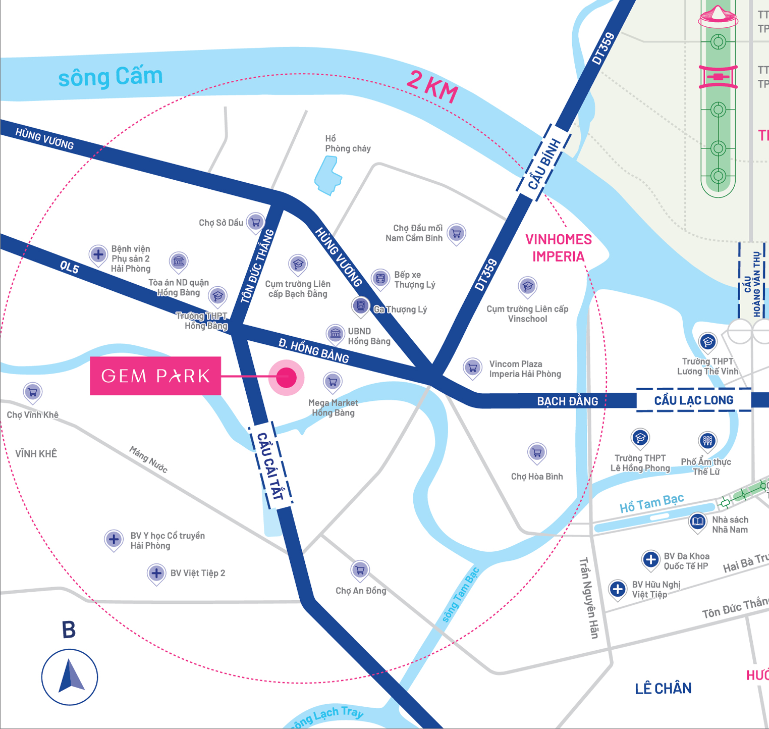 Vị trí Gem Park Hải Phòng nằm tại khu đô thị mới 2A Hồng Bàng, phường Sở Dầu, quận Hồng Bàng, thuộc một trong ba quận trung tâm lâu đời nhất tại Hải Phòng. Với vị trí chiến lược, dự án Gem Park không chỉ thuận lợi trong việc di chuyển tới các khu công nghiệp lớn như An Dương, Tràng Duệ, mà còn tận hưởng tầm nhìn hướng sông, thành phố, và thung lũng, tạo ra không gian thoáng đãng hiếm có trong lòng thành phố cảng sôi động.